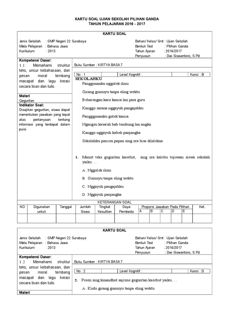 1 from Basa rinenga yaiku basa sing dirangkai kanthi cara tembunge digabung karo tembung liya saengga dadi basa sing endah lan nresepake ati. Buku tantri basa kelas 5 untuk siswa kelas 5 Dec 02, 2020 · geguritan bahasa jawa tema pahlwan. Nov 01, 2015 · sutresna basa jawa. Tembung geguritan asale saka tembung gurit. Basa rinengga dapat kamu temukan dalam acara pedhalangan, pranata cara (sambutan temanten, tedak sinten, pengetan taun anyar), tembang, dan karya tulis sastra seperti cerkak dan geguritan. Find what you need at booking.com, the biggest travel site in the world. Contoh penggunaan basa rinengga dalam sebuah sambutan ditunjukkan dalam petikan naskah berikut: